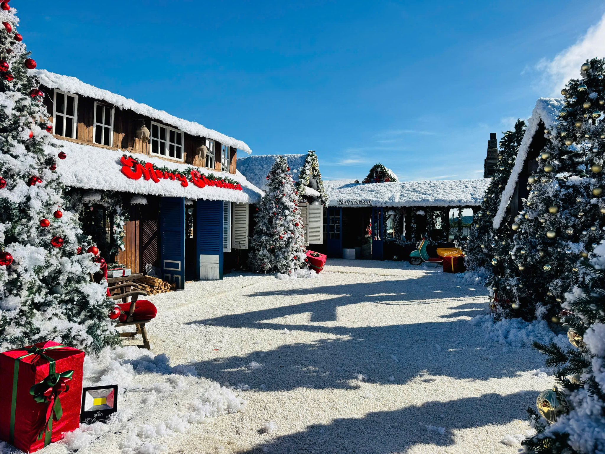 Thị Trấn Tuyết là tọa độ khiến bạn có cảm giác như lạc vào xứ sở mùa đông Bắc Âu. Không gian được thiết kế tone trắng chủ đạo: nhà gỗ trắng, cây trắng, tường trắng, tạo hiệu ứng như tuyết phủ nhẹ lên tất cả.