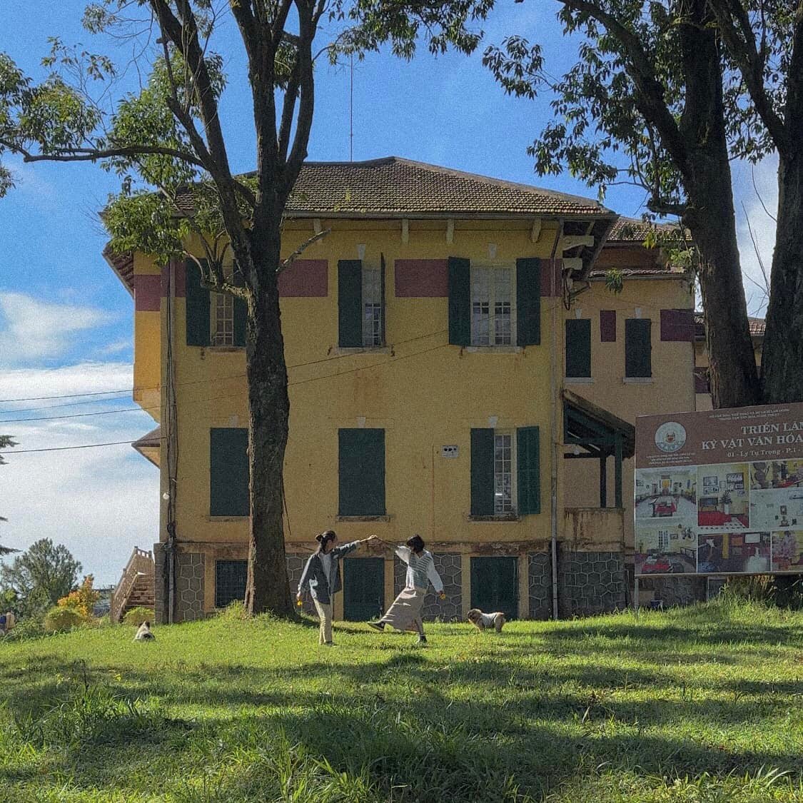 Dinh Tỉnh Trưởng mang đậm kiến trúc Pháp cổ, có bức tường vàng, cầu thang uốn cong và các ô cửa kính lâu năm. Không gian xung quanh phủ đầy cây xanh, tạo nên cảm giác như bước vào một phim trường cổ điển.
