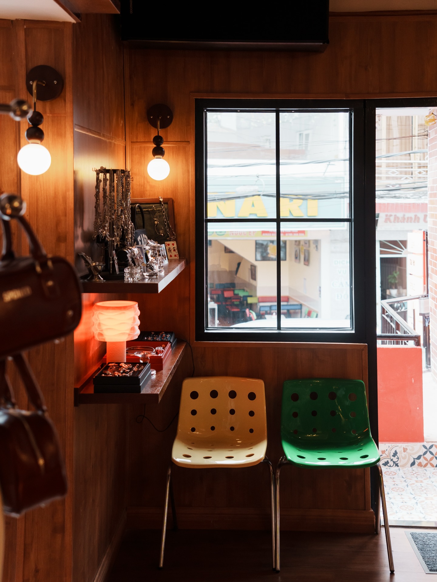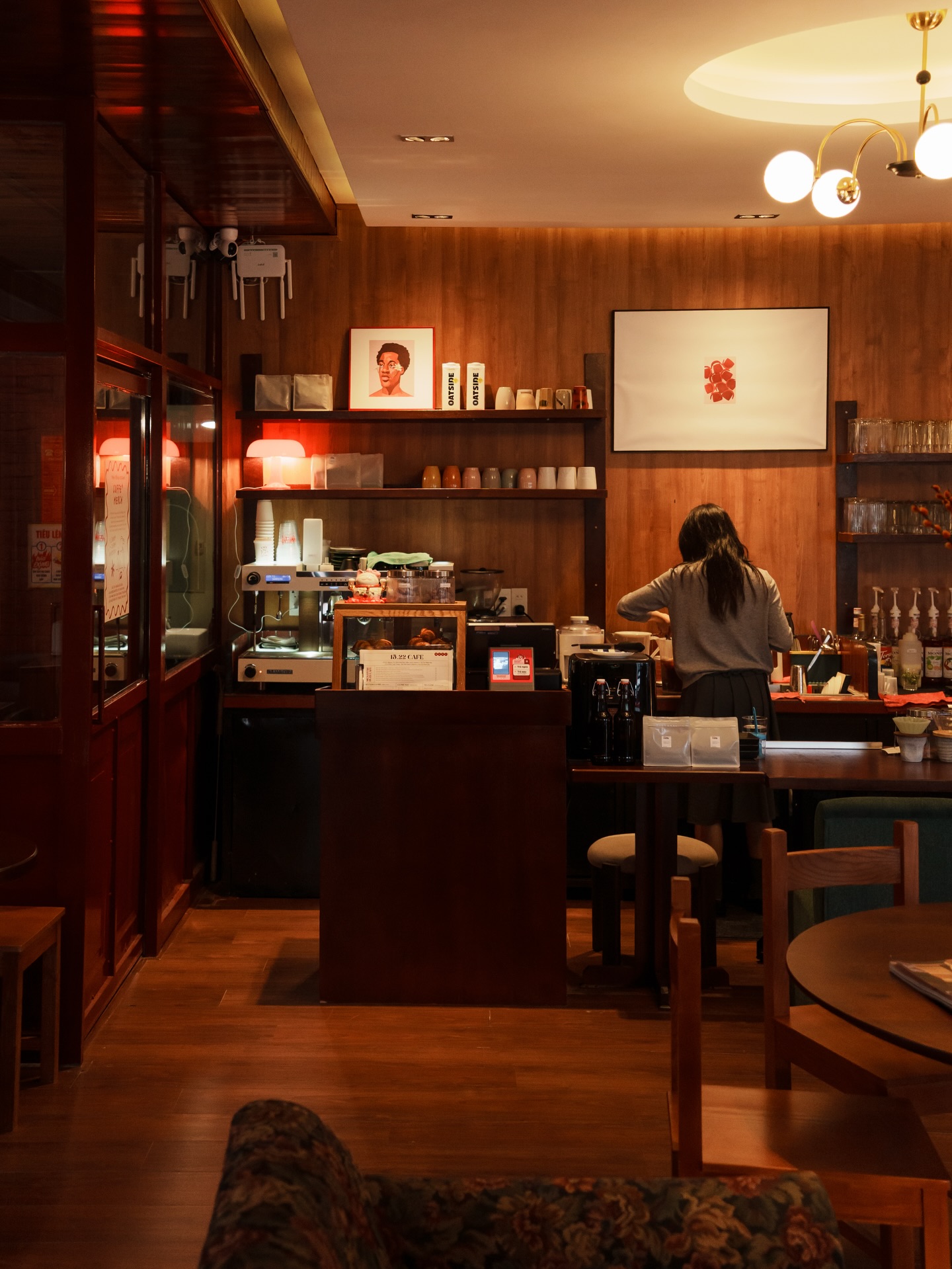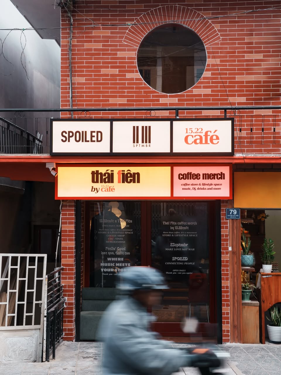Thái Phiên chia không gian thành hai nhịp rõ ràng. Tầng trệt là khu shopping nhỏ của các local brand, lầu trên là quán cà phê ấm áp với tông đỏ – nâu gỗ, ánh đèn vàng dịu và tiếng nhạc từ đĩa than khe khẽ.