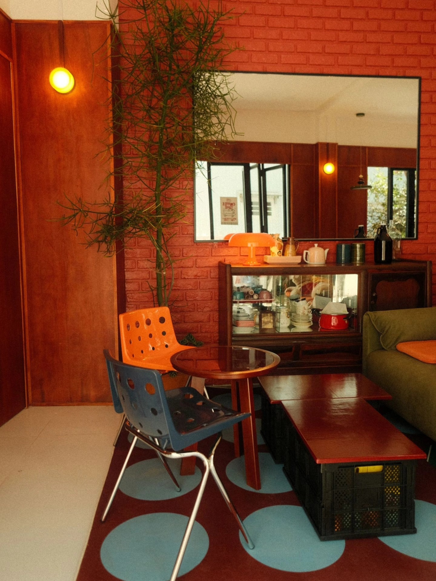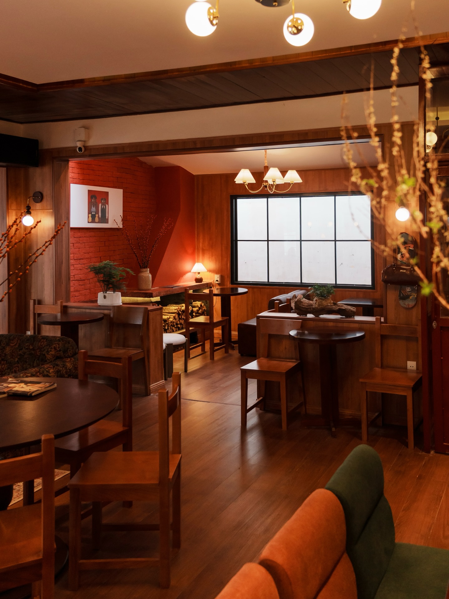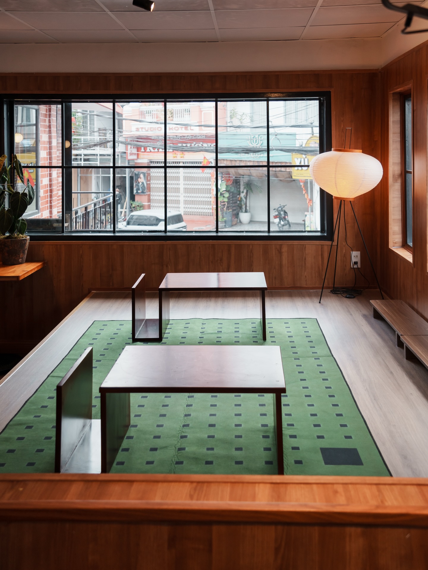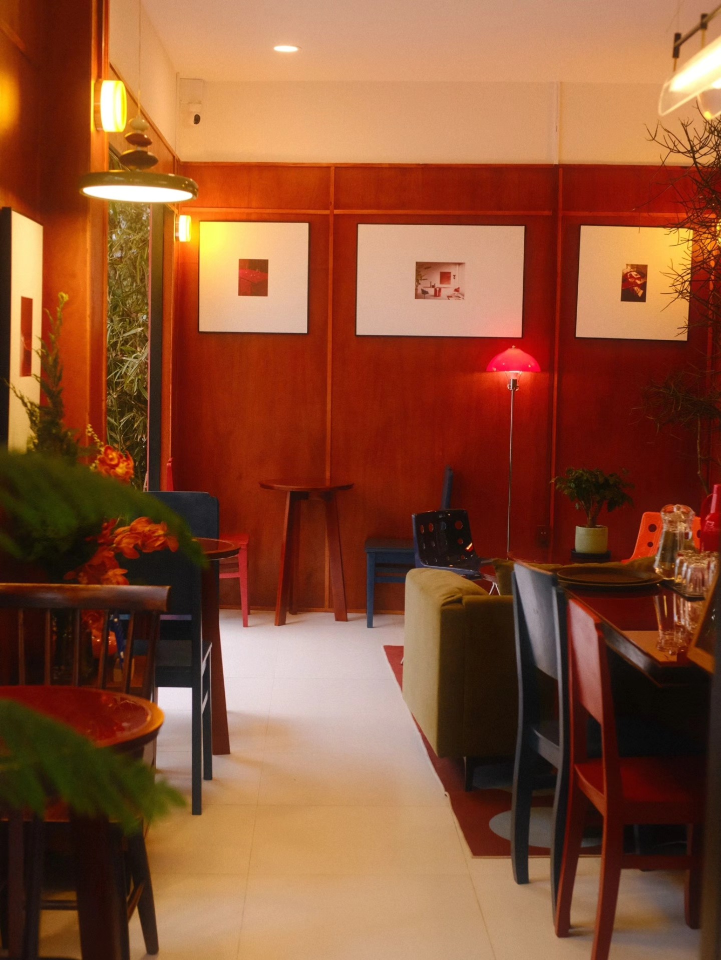 Thái Phiên chia không gian thành hai nhịp rõ ràng. Tầng trệt là khu shopping nhỏ của các local brand, lầu trên là quán cà phê ấm áp với tông đỏ – nâu gỗ, ánh đèn vàng dịu và tiếng nhạc từ đĩa than khe khẽ.