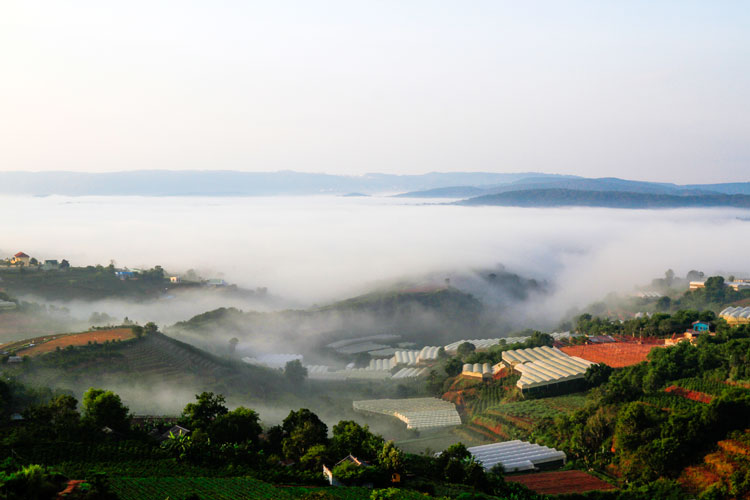 Khác với các đồi săn mây nổi tiếng, khu đồi Xuân Thọ vẫn giữ được nét rất “đời”: đồi thông, đồi chè, nhà kính rải rác. Buổi sáng sớm có thể gặp sương mỏng và ánh nắng xiên qua rừng thông.