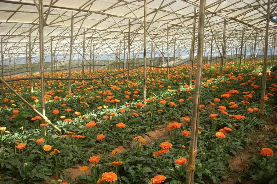 Làng hoa Vạn Thành được xem là vựa hoa lớn nhất Đà Lạt, đặc biệt nhộn nhịp vào thời điểm cận Tết. Những nhà kính trải dài với đủ loại hoa cúc, hồng, ly, đồng tiền… nở rộ, tạo nên khung cảnh đầy màu sắc.
