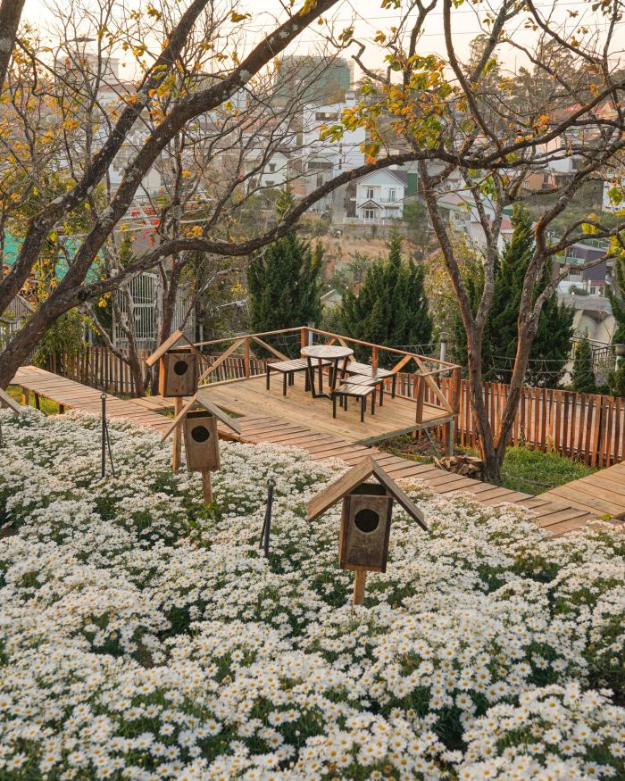Tháng 10 – 11, cúc họa mi trắng nhỏ xinh xen kẽ trong mùa dã quỳ vàng rực. Những bông hoa giản dị, trong trẻo khiến người ta liên tưởng đến sự thuần khiết, nhẹ nhàng. Đây là loài hoa tạo điểm nhấn đáng yêu cho những ngày đầu đông se lạnh ở phố núi.