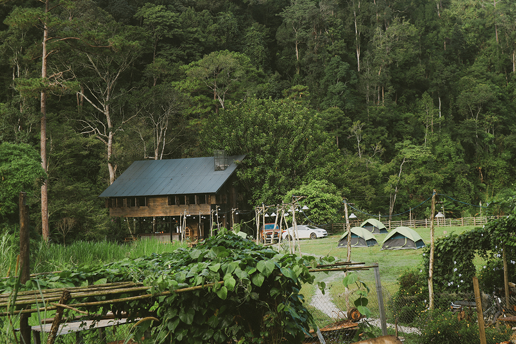 Không gian: Lều gỗ kết hợp lều vải, ánh đèn vàng tạo cảm giác ấm cúng về đêm.