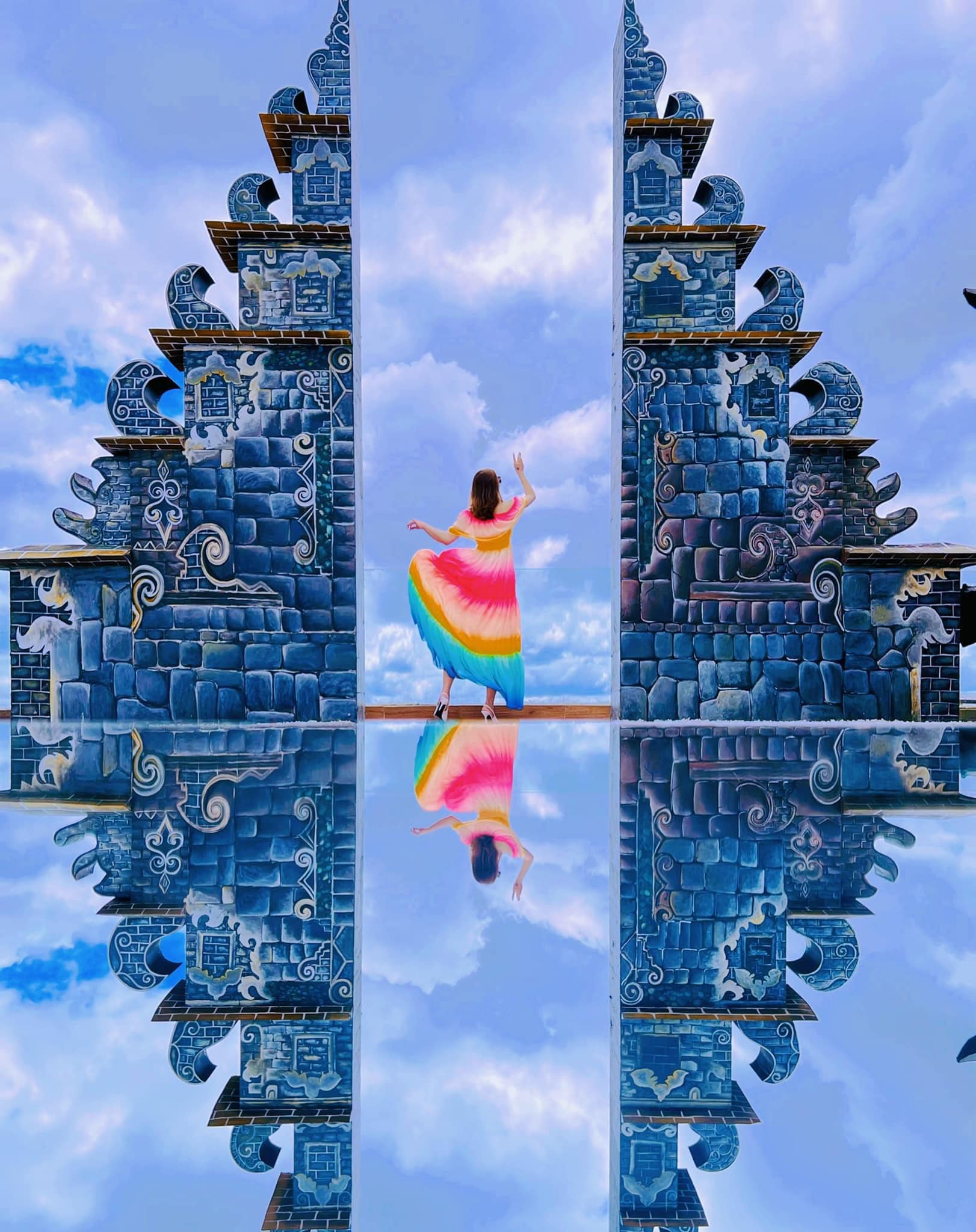 Cổng trời Bali là một trong những điểm check-in nổi bật với khung cảnh mô phỏng kiến trúc cổng trời nổi tiếng tại Indonesia. Nơi đây thu hút du khách bởi góc chụp nhìn ra đồi núi và hồ nước phía xa, tạo nên bức ảnh mang phong cách rất đặc trưng.