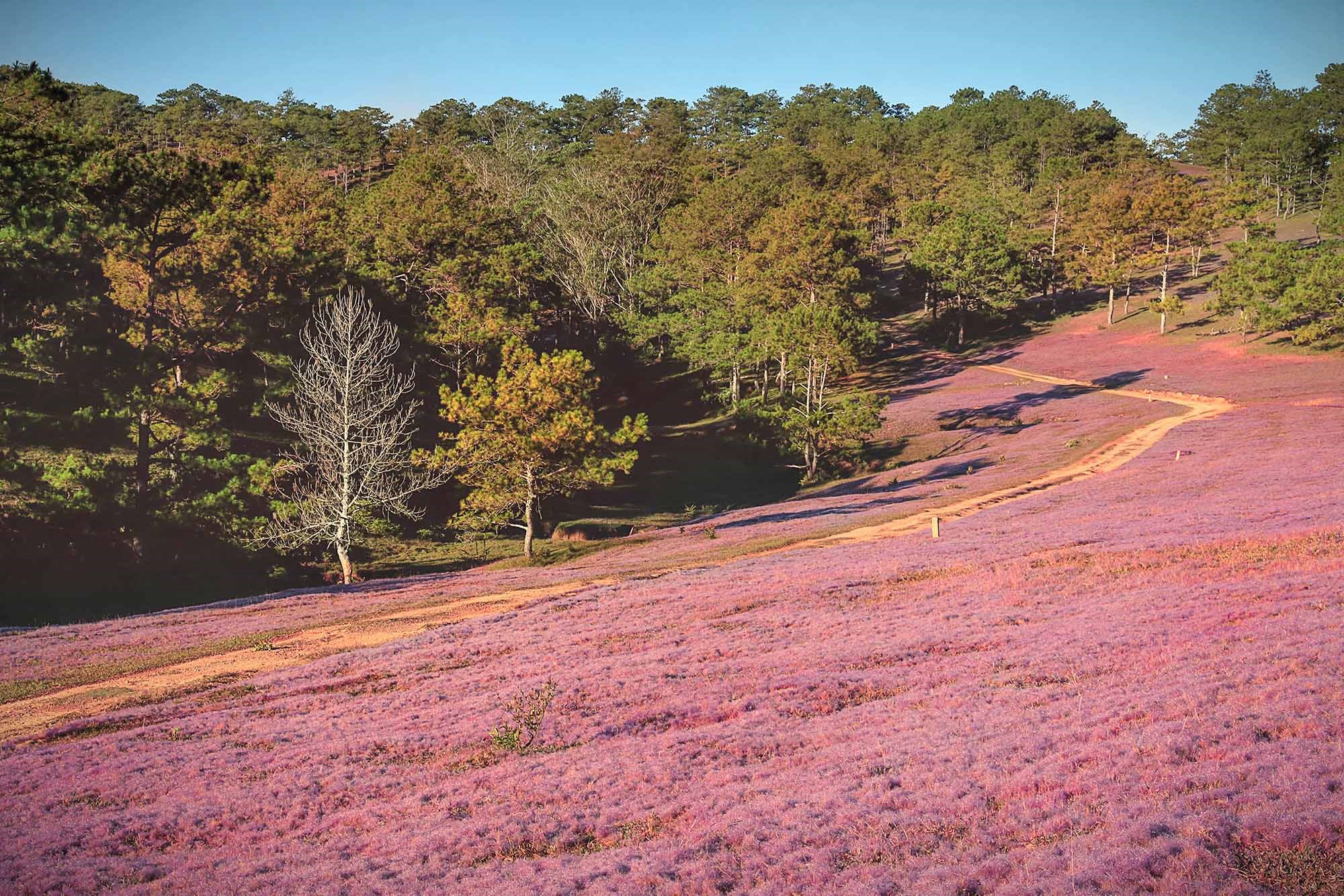 Điểm nổi bật: Cỏ hồng mọc dày dưới tán thông, sắc hồng nhạt ẩn hiện trong sương sớm, không gian vừa hoang sơ vừa lãng mạn.