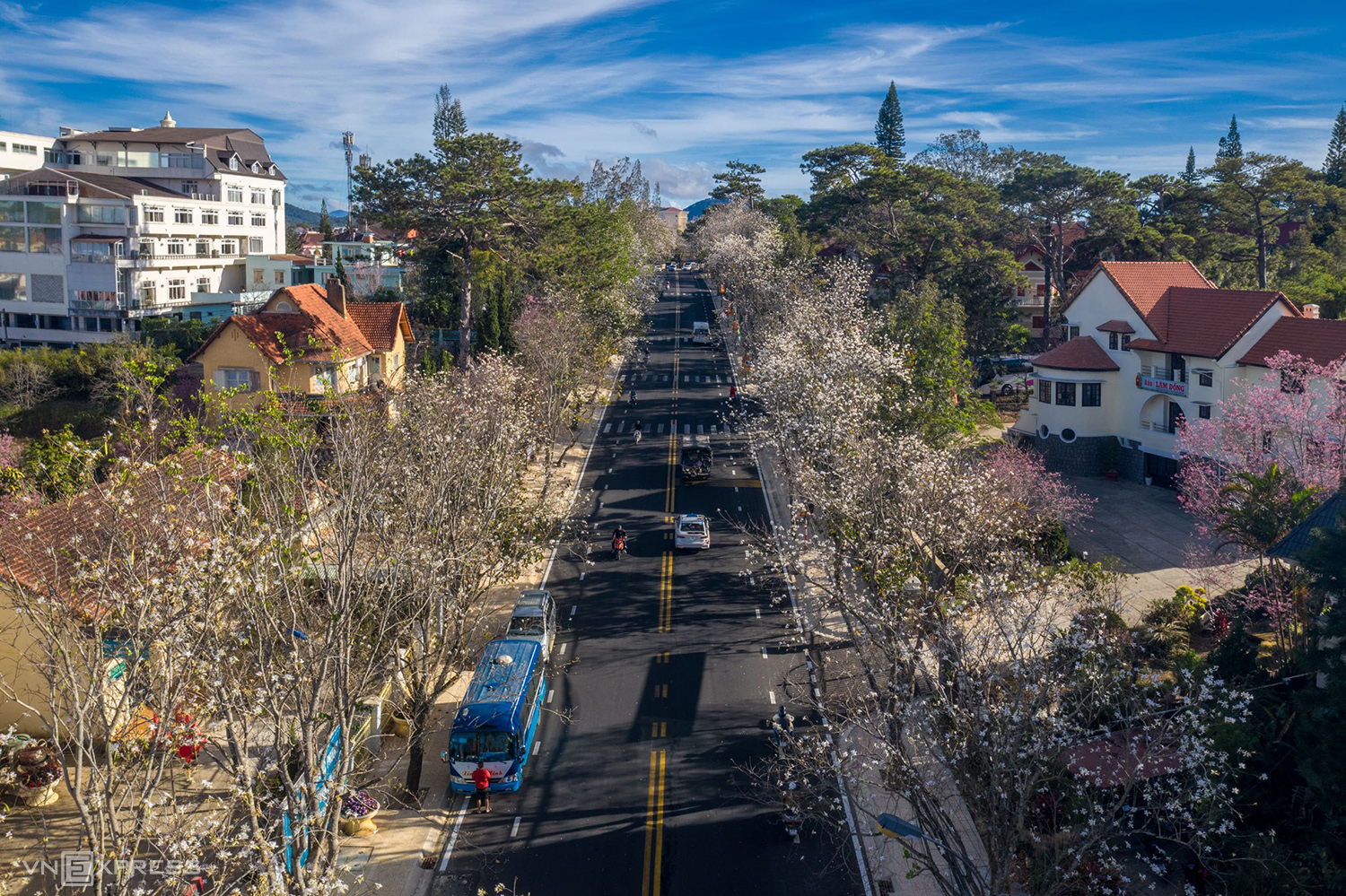 Nhắc đến đường hoa Tết ở Đà Lạt, Quang Trung gần như là cái tên “quốc dân”. Hàng mai anh đào nở dày, tán thấp, màu hồng nổi bật trên nền trời xanh tạo nên khung hình rất bắt mắt.