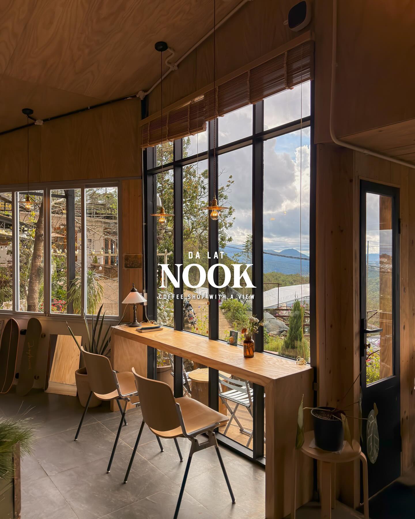Nook là một trong những không gian xanh hiếm hoi nằm giữa thung lũng mà vẫn gần trung tâm. Không gian xanh mướt như khu vườn nhỏ, view mở rộng nhìn xuống rừng cây và nhà gỗ. Quán có nhiều góc ngồi yên tĩnh, phù hợp cho những ai thích đọc sách hoặc làm việc trong tiếng nhạc acoustic dịu dàng.