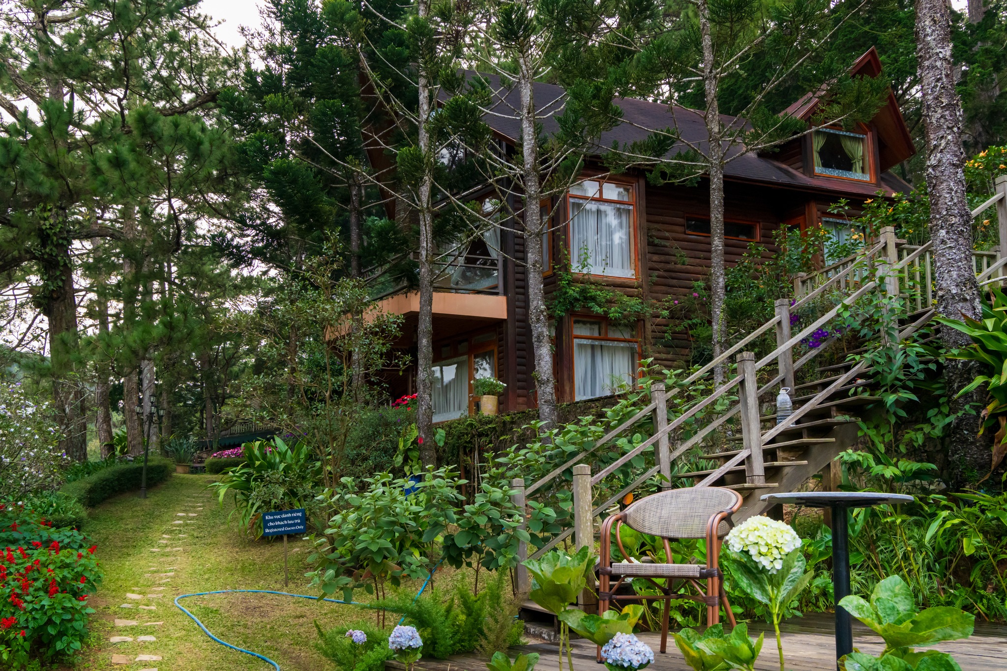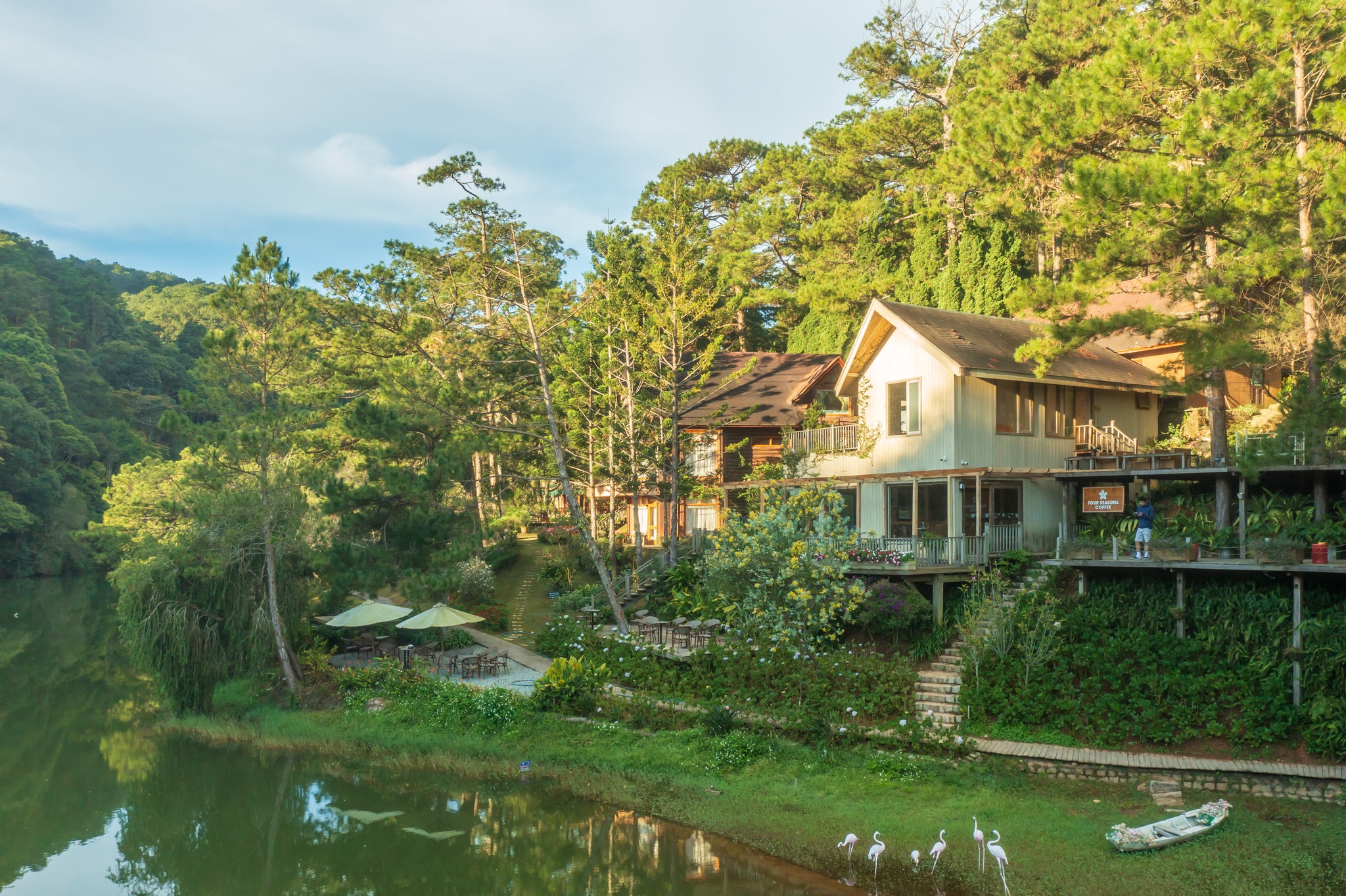 Ẩn dưới tán thông là các căn nhà gỗ mang phong cách mộc mạc, màu sắc trầm, hài hòa với cảnh quan xung quanh. Các công trình không xây cao, không che khuất tầm nhìn, giữ được bố cục tự nhiên của thung lũng.