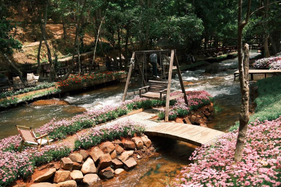 Nếu bạn muốn tìm về một Đà Lạt mộc mạc và yên bình, Thôn 13 chính là điểm đến hoàn hảo. Khu vườn rộng mở với đồng cỏ xanh, suối nhỏ và những căn nhà gỗ ẩn mình giữa đồi hoa khiến nơi đây vừa gần gũi vừa thơ mộng.