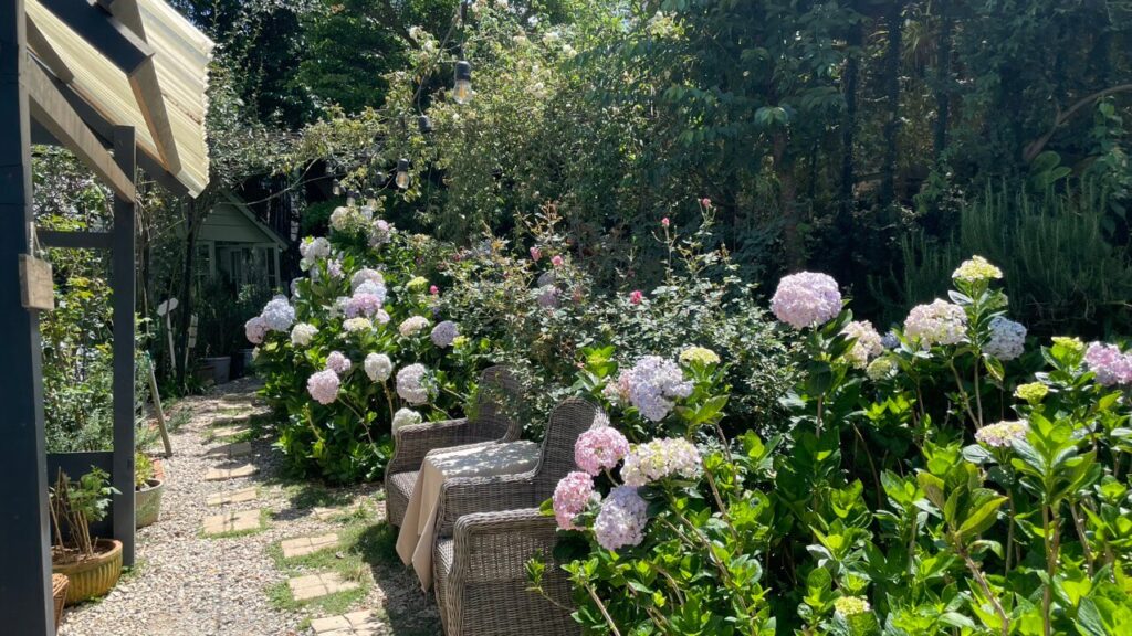Quán cà phê tại đây mang phong cách gỗ rustic, ánh đèn vàng ấm áp, mở ra tầm nhìn hướng ra thung lũng hoa muôn sắc. Mỗi mùa, khu vườn lại thay áo mới: mùa cúc, mùa cẩm tú cầu, mùa cỏ hồng… tất cả đều khiến người ta không nỡ rời.