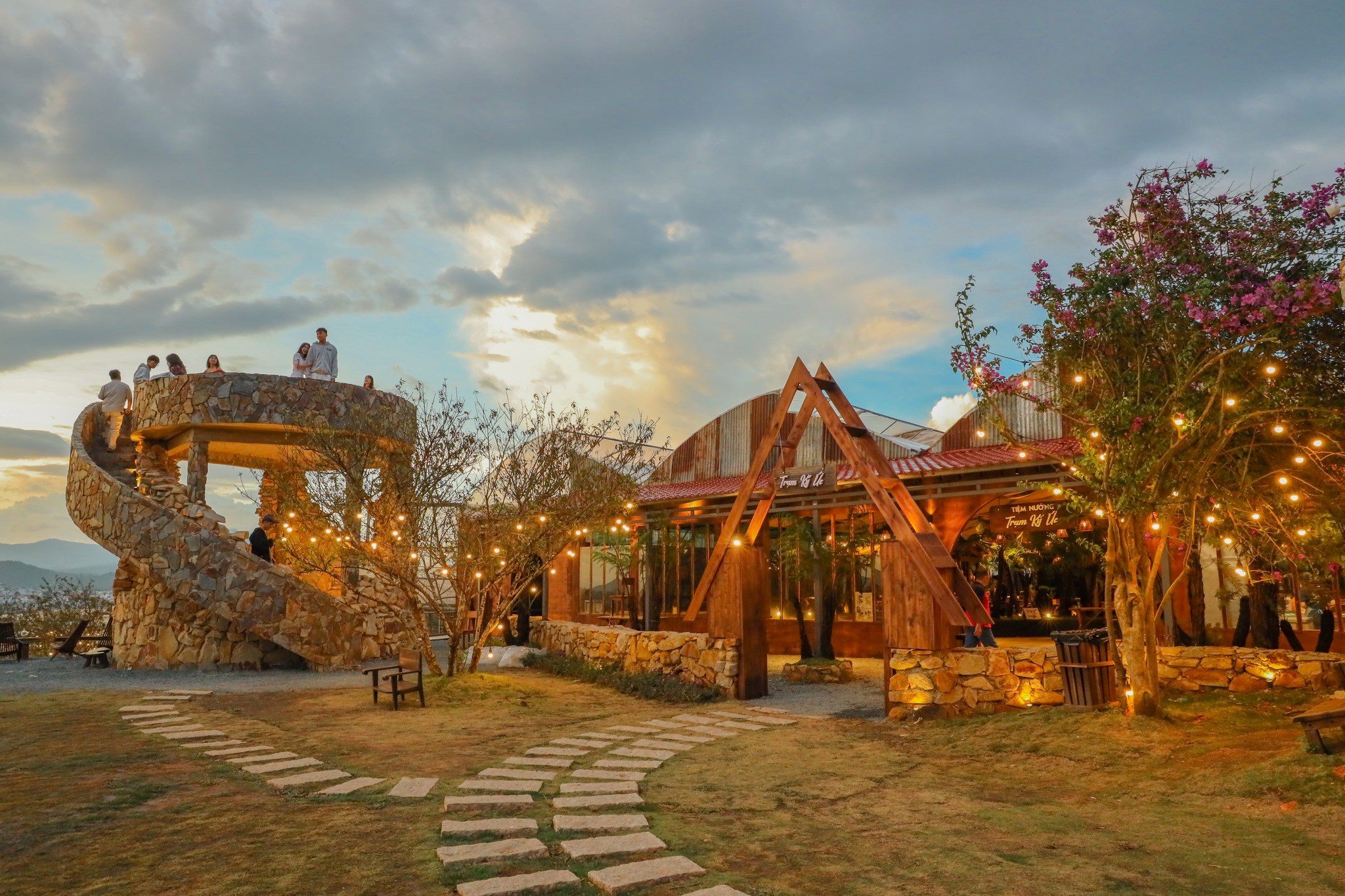 Tiệm Nướng Thương Thương nằm trên con đường nhìn thẳng xuống thung lũng, nơi hoàng hôn phủ ánh vàng xuống những mái nhà nhỏ phía xa. Không gian quán mở hoàn toàn, giúp thực khách vừa thưởng thức món nướng, vừa ngắm trọn vẻ đẹp tự nhiên đặc trưng của Đà Lạt.